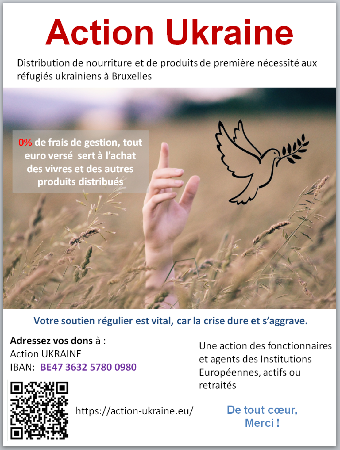Action pour les réfugiés ukrainiens à Bruxelles Grandes réussites et évolutions…. L’initiative continue : Malheureusement, sa nécessité est toujours d’actualité. Nous avons eu, grâce à l’OIB, un nouveau local afin de pouvoir continuer à distribuer un soutien alimentaire de premières nécessités aux personnes ayant fui l'Ukraine en raison du conflit en cours. Nous avançons ! L'objectif est d’offrir aux familles une aide d'urgence pour les premiers mois, parfois plus, afin d’assister modestement à soutenir leur vie. Depuis près de 3 ans, nous avons distribué de nombreux repas et votre générosité nous a profondément aidé à offrir un peu de normalité dans des quotidiens que la guerre à déraciné. Concrètement, dès à présent : 1. Le nouvel entrepôt se situe Rue des Éburons, 77 à 1000 Bruxelles; 2. Des frigos et des installations sont encore prêtés par l’OIB pour le stockage ; 3. Des distributions de jouets seront organisées si nous en avons la possibilité ; 4. Des cours de langues, seront maintenus en fonction de la disponibilité ; 5. La Banque Alimentaire continue de soutenir l’action et la soutient activement. Tout cela avec 0€ de frais de gestion Ceci n’est possible que grâce au bénévolat de collègues, au soutien de l’administration, des représentants du personnel de tout bord, de l’Association Femmes d’Europe et de Banque Alimentaire. Last but not least, encore très grand merci à l’Office pour les Infrastructures et la logistique à Bruxelles (OIB) pour le stockage, la logistique et les mobiliers fournis. Pour donner directement à l’action : Action Ukraine UE Pour donner directement en nature au site rue des Éburons, 77: Mardi de 10 à 14h / Mercredi de 13 à 17h / Jeudi de 14 à 18h / Samedi de 10 à 13h 26/05/2025 |